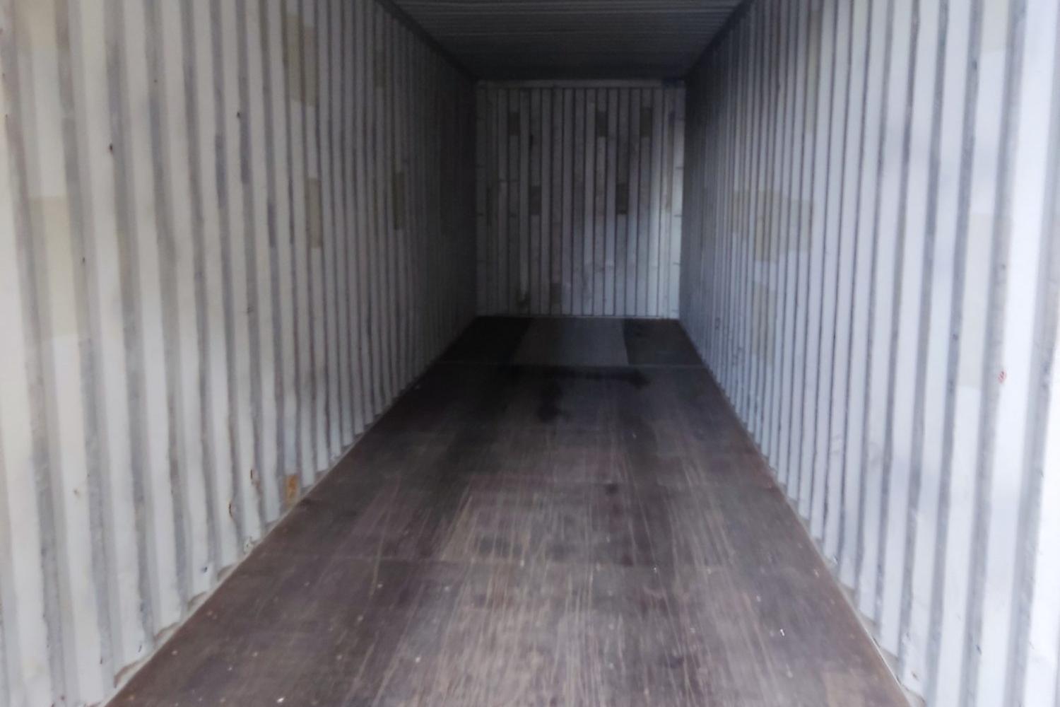 The 40 ft high cube shipping container is constructed from Corten steel and rated wind and watertight. The container includes exterior hinged double doors at the end, two locking bars on each door, two forklift pockets on each side, a 28mm marine plywood floor on steel cross members, and four vents.
